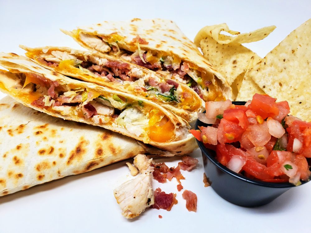 Chicken, bacon, shredded cheese blend melted in a grilled flour tortilla and served with chipotle ranch and salad mix, your choice of salsa, and sour cream