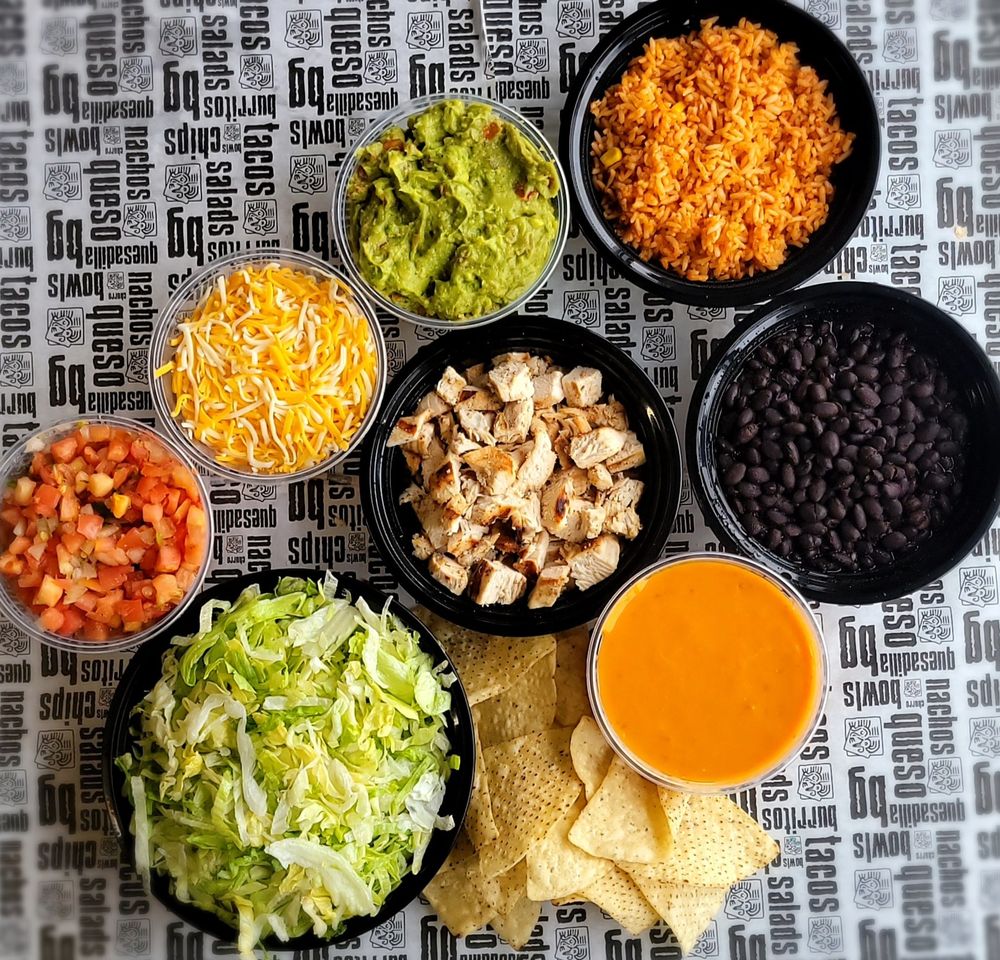 Shredded cheese blend, Mexican or brown lime rice, black beans, salad mix, guacamole, sour cream, and pico de gallo