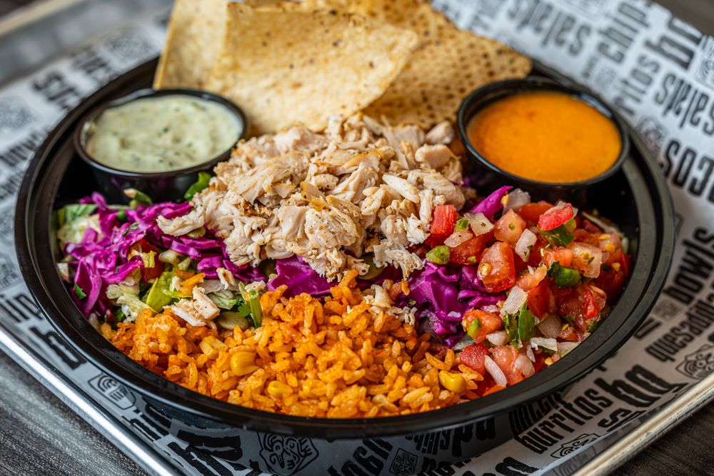 Your choice of meat, Shredded cheese blend, sautéed veggie mix, Mexican or brown lime rice, sour cream, and border salsa