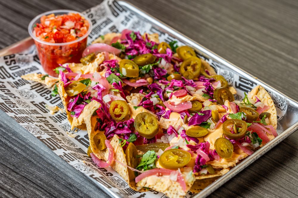 White cheddar cheese, brown lime rice, beef brisket tossed with a red chili bbq sauce, crispy jalapeno, cilantro, red cabbage slaw.